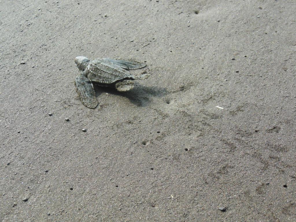 Baby leatherback sea turtle (Dermochelys coriacea) heading out.